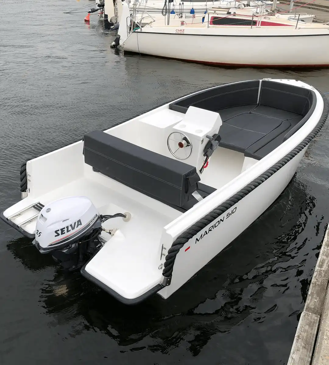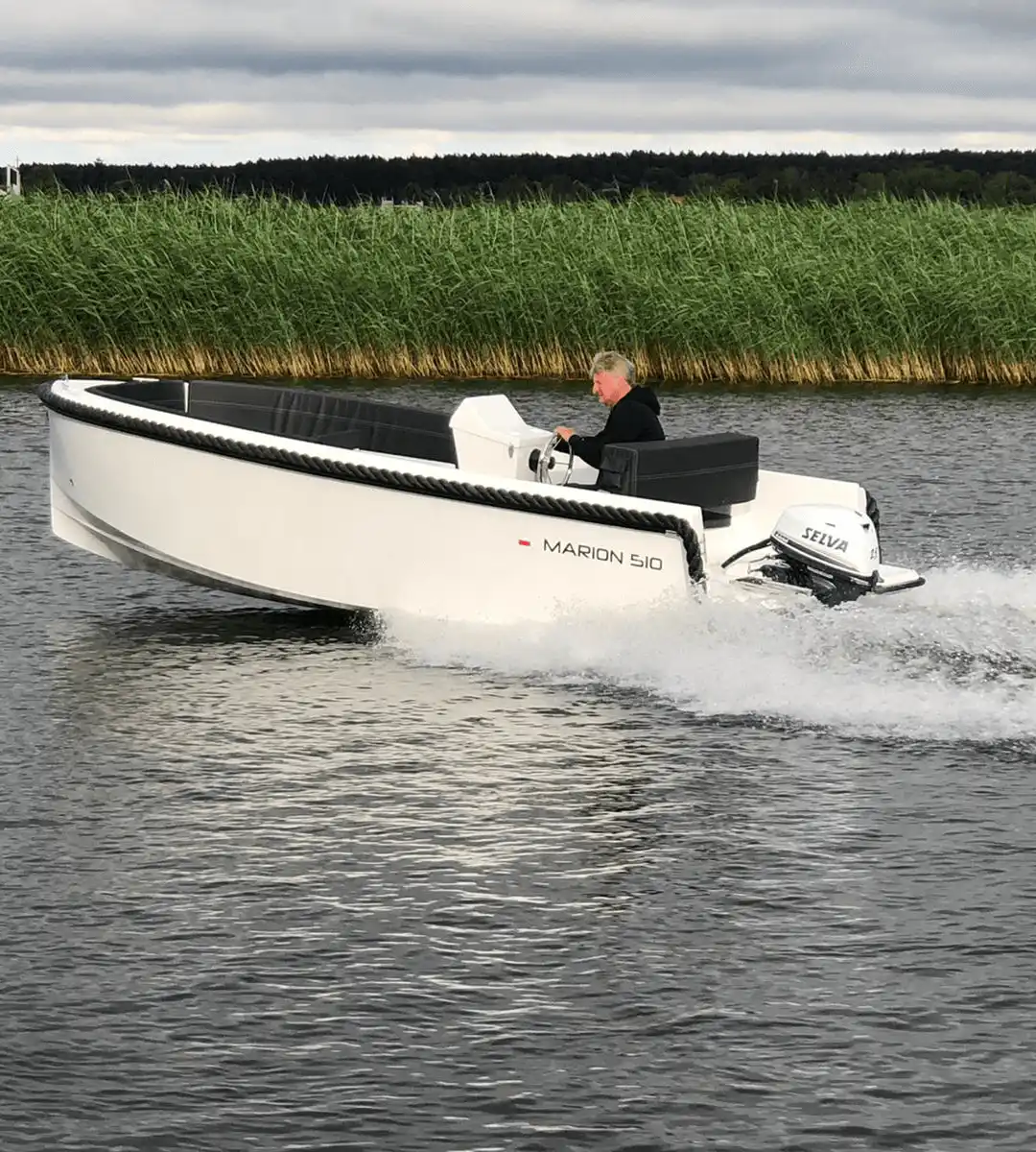 Marion 510 to łódź dla maksymalnie 5 osób, stworzona do komfortowego pływania po jeziorach i kanałach. Wygodne przednie siedzenia z możliwością rozłożenia pokładu słonecznego oraz obszerna, tylna rozkładana kanapa sprawiają, że sprawdzi się zarówno na spokojne rejsy, jak i relaks na wodzie.